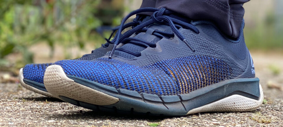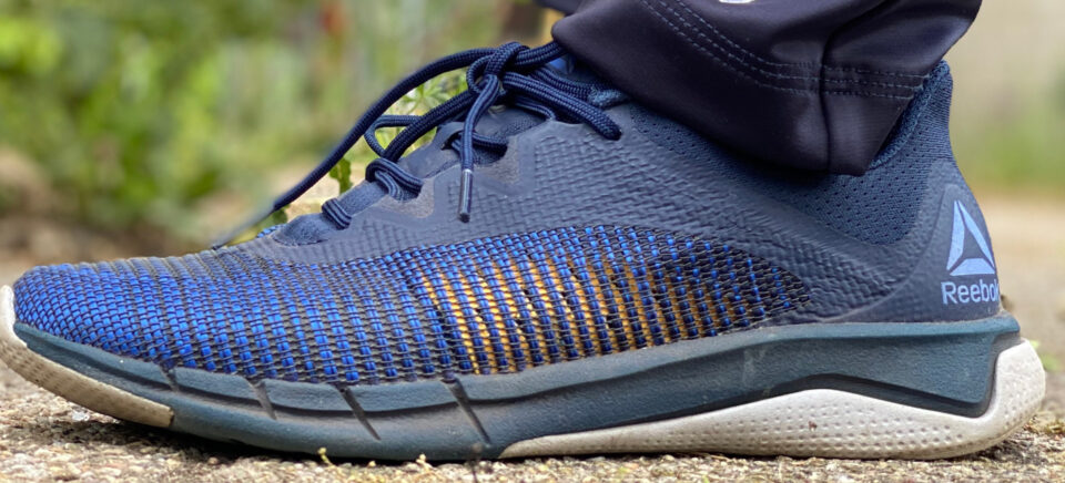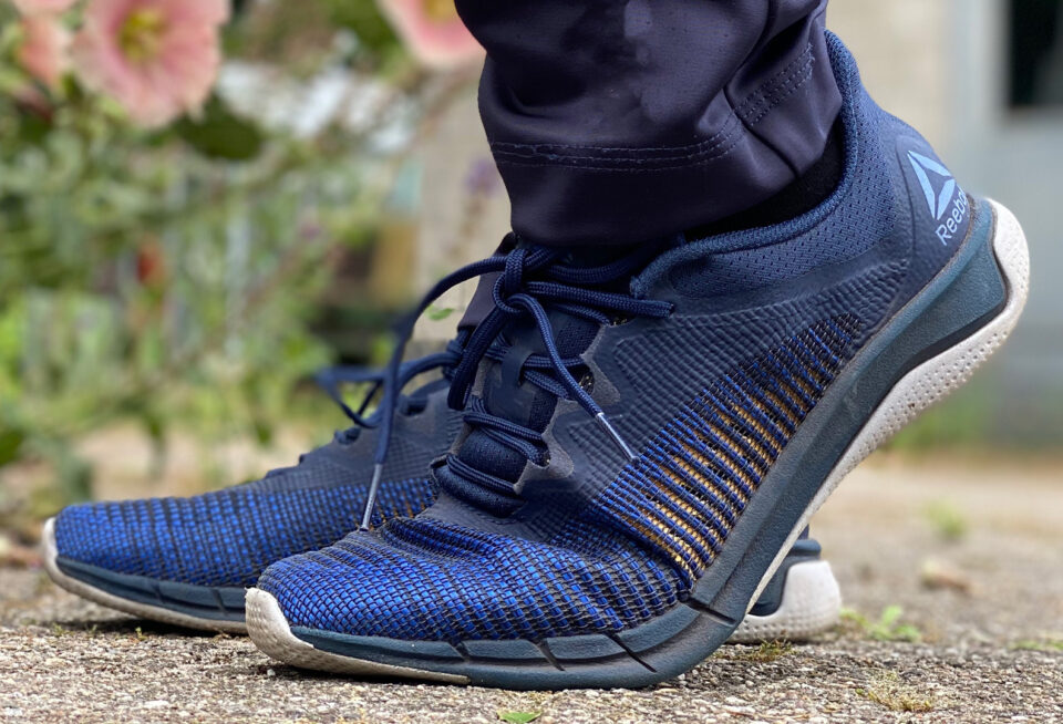 The orange detailing behind the blue bars on the sides of these Reeboks tries to blend in with the flowers in the back. But they are more pinkish. They don't need to blend in, but can stand out as my feet likes to show them off.