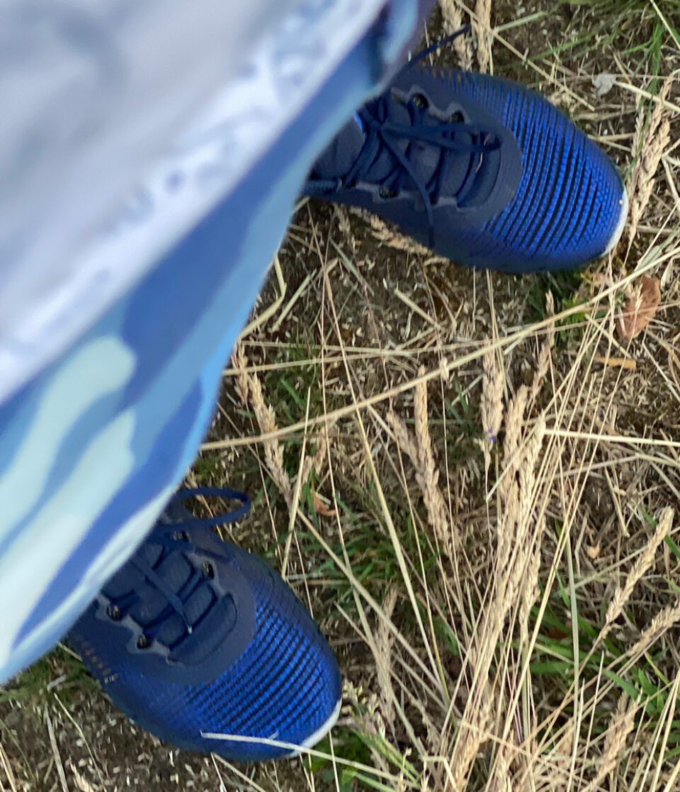The hay is now piled up in rows, ready to bale. Because of the shape of the field, the rows make a combination of a maze and a circuit. Good for a nights walk in these Reeboks. I blend in nicely in my camouflage outfit...