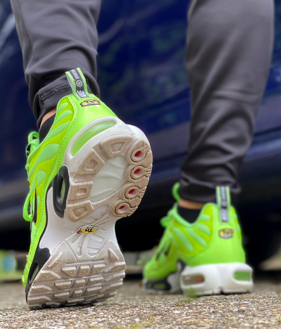 I don't think we have any discussion when I say that these Nike Tn sneakers can participate in the colorful week. The bright neon yellow just bursts of your monitor, phone or whatever display you are watching them on. Disadvantage of the white soles is that you have to pick a nice day to wear them. even though you will never keep them clean. And yes, the red hemispheres are a magnet to small grit. One step outside and guaranteed you'll carry around a rock with you. They rock!