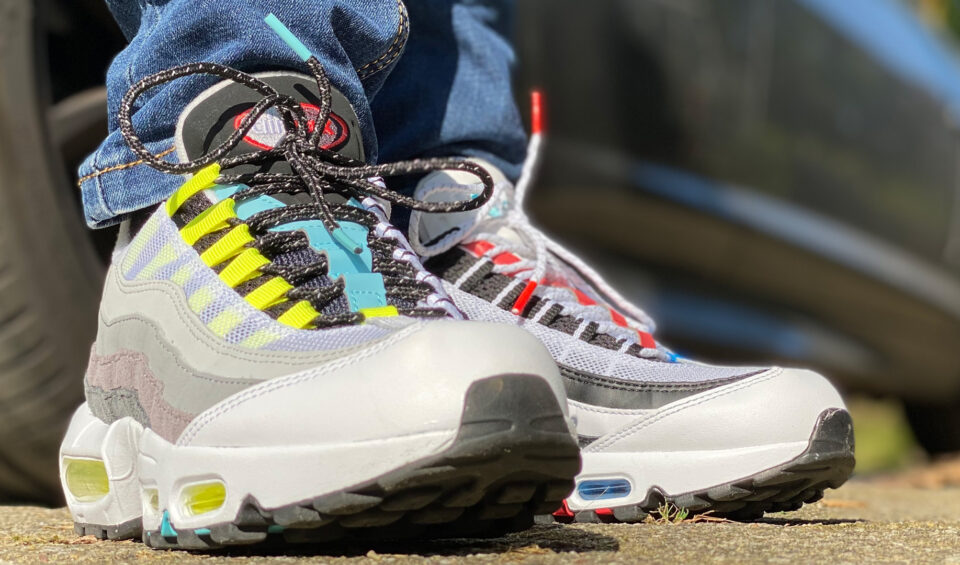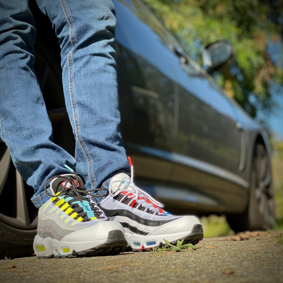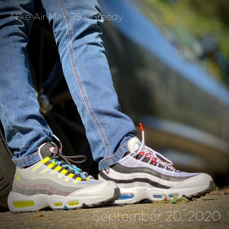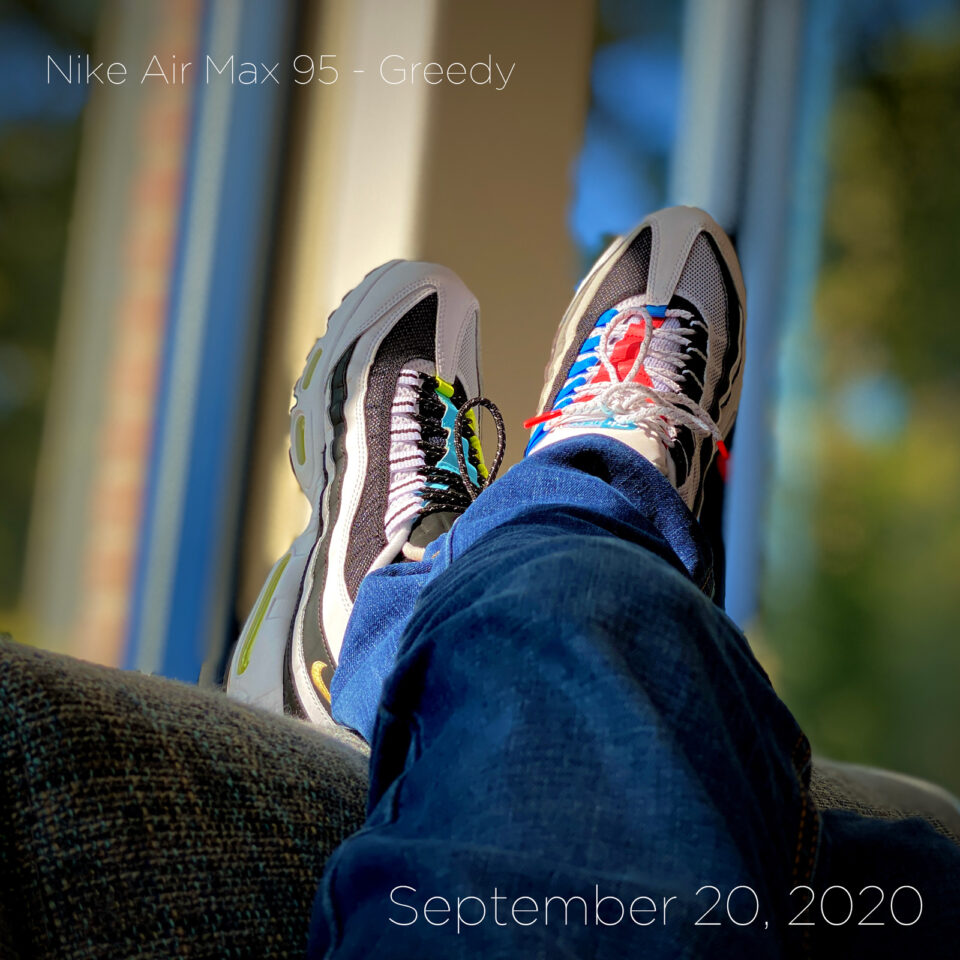 Last week I sneakershot these Nike Air Max 95 Greedys in the colorful sneakers theme. This week in the white theme. These 95s unlace a little bit less wide than the others I have. So they are built differently. The new generation I suppose. As if it is an issue.