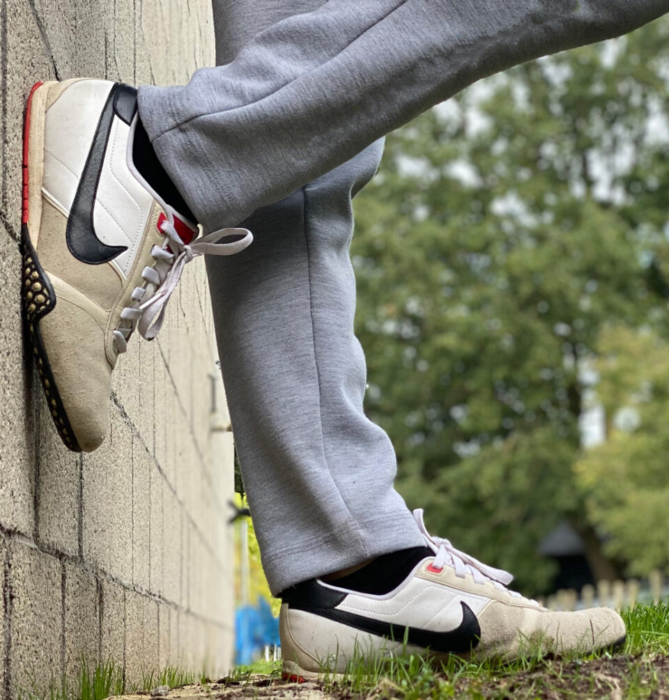 A bad match today. A pair of blue jeans would complement these Nikes much better. It is what it is for now. The wall however does match with the sneakers. These Nike Montreals make a ckicking noise when I walk. Something inside the sole must be loose, but I can't seem to find it. But they still walk great.