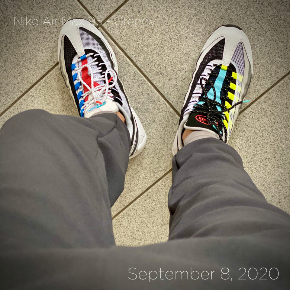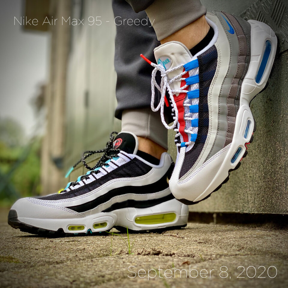 Today a new pair of sneakers. Perfectly suited for this weeks colorful sneakers. These new Nike Air Max 95 - more than often also called Greedy - are a fresh color combination where no two parts are the same. The first reaction I got was if I wasn't wearing two different sneakers. I do. A left and a right one. I love the fit and comfort of the 95s. And the color combinations of these are great.